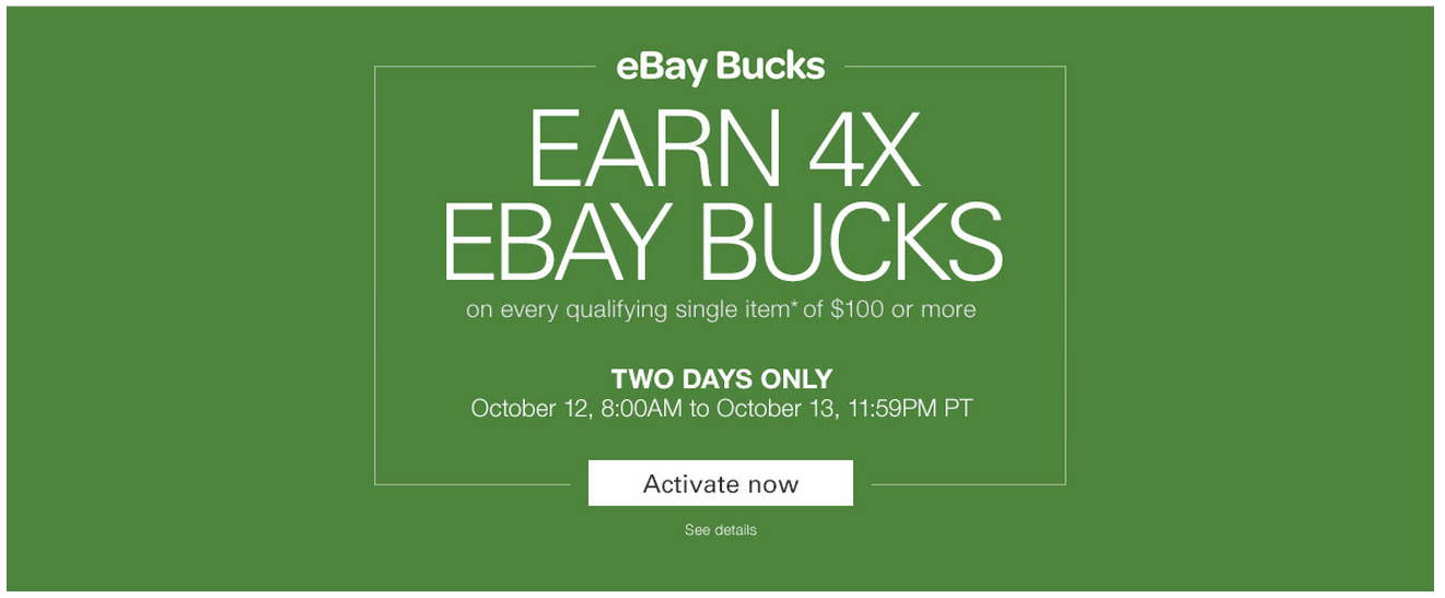 4x eBay bucks on any item of $100 or more. This starts at 11am ET so please keep that in mind and don't jump the gun!